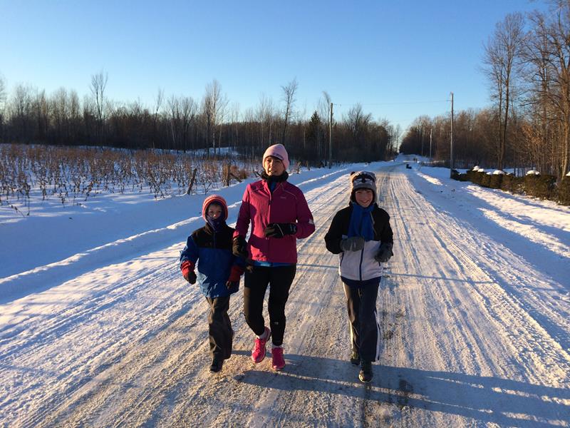 At 3:00 yesterday afternoon I told everyone to start getting ready for a 3:30 run. Evan quickly argued that it doesn’t take half an hour to get dressed for a run. He was right…an HOUR later we managed to head out the door. I’m heading into my third winter of running. I have all the needed layers to stay warm while still being able to actually move. Trying to get the kids ready for a run in -16C (3F) proved to be a bit more interesting. The challenge was to find enough layers to keep them warm without making them look like Ralphie’s little brother in A Christmas Story (picture a kid so bundled up he can’t make his arms go down). I did make a mental note to plan any future family fun runs in warm weather – shirts, shorts, shoes and out the door!